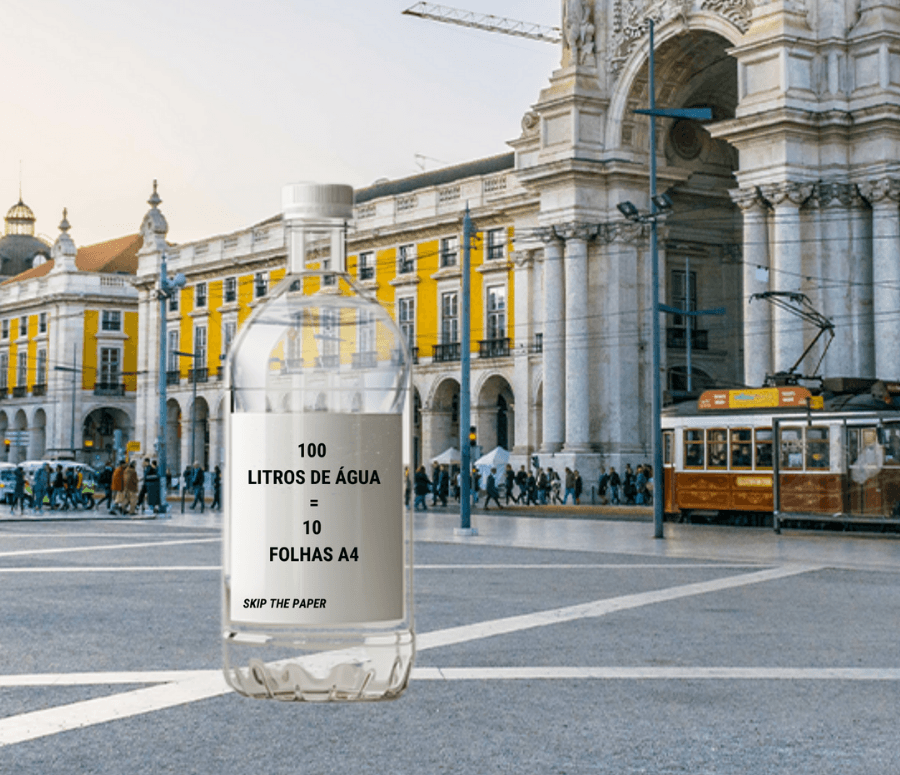 Esta ativação, representa o impacto visual do que é necessário para produzir 10 folhas de papel A4 - 100 litros.