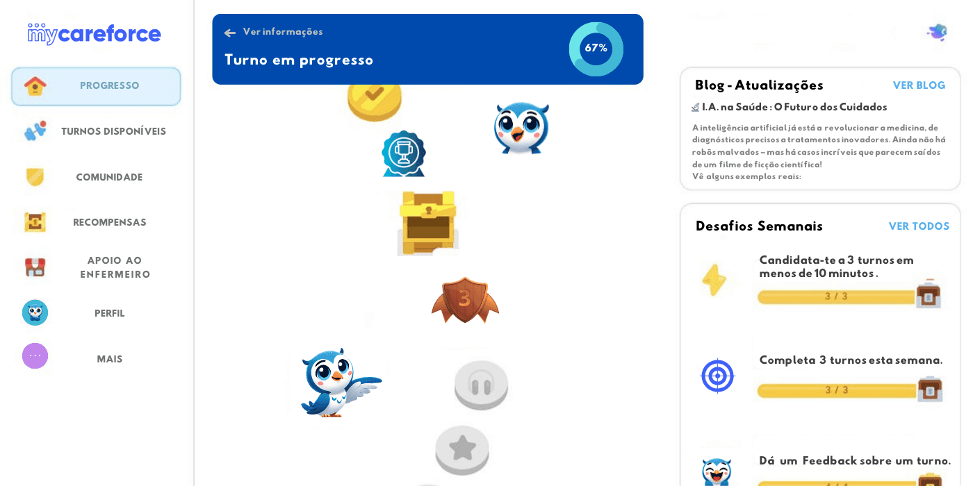 Implementação de um sistema de patamares e benefícios para recompensar a frequência de turnos realizados. Cada nível desbloqueará vantagens, como descontos em marcas potencialmente parceiras (as escolhidas são The Body Shop, Headspace, Skechers e Celeiro), incentivando a continuidade na plataforma.